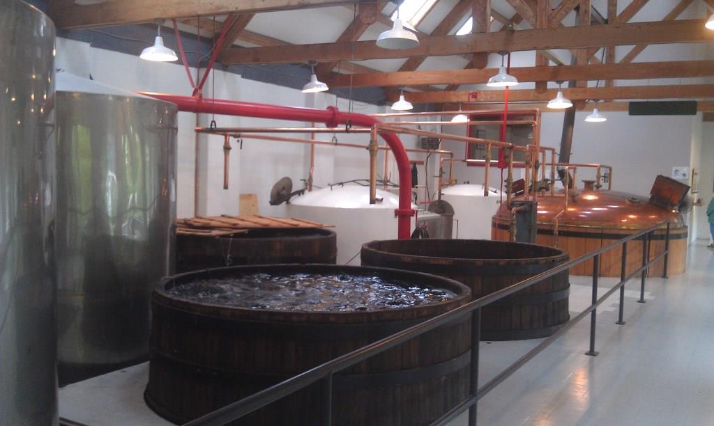 Glenora Distillery was founded here, near Mabou, because of the water. The water comes down off the highlands in a good sized stream but they have to pump it into a holding pond so they have the 2,000 gallons they need to mash the barley. The mash tun is huge compared to the breweries I’ve seen. The mash process is much the same as beer though, temperature is held at about 160 F and paddles mix the mash while a pump recirculates it so the finer particles aggregate on the bottom to form a filter. The liquid from the mash, now called “wort,” is cooled while it is pumped into 3 different wooden fermentation vessels that look like huge hot tubs…but 12 feet deep.