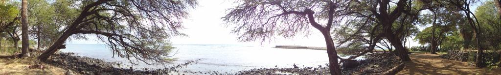 There is a dot of a town on this road, Olowalu (“many hills”), that captures this fine grain diversity. There is the Olowalu General Store and the Olowalu Juice Stand. And that’s it for business. Taking a turn toward the ocean in Olowalu leads you within yards to a gated private home, but a dirt track to the left leads around the private property to the sea. There is a parking lot and a short walk to the edge. Turning right leads to a mown lawn, part of which is private and part public, and a jetty.